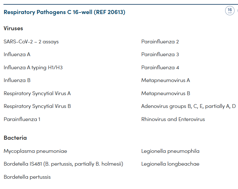 Der HybriSpot12 PCR Auto bietet eine automatisierte Lösung für Syndromic Panel Testing. Das System basiert auf einer innovativen Kombination von Multiplex-PCR, Macroarray Chips und der innovativen DNA Flow Technologie, was schnelle, sehr sensitive und genaue Ergebnisse ermöglicht. Der Respiratorische  Flow-Chip-Kit kann folgende 19 Viren und 3 Bakterien in einer Probe gleichzeitig nachweisen:
